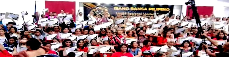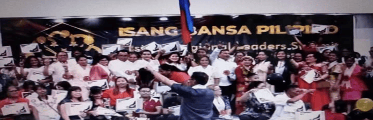 Dahil kami ang Isang Bansa Pilipino, inilaan ang kilos at damdamin para tulungan at pagkaisahin ang mga Pilipino. Ang aming dakilang adhikain at siya din aming sandalan at kalakasan, ito ang pagkakaisa. Pagkabuklod-buklod at maunlad na buhay ang aming pangarap sa lahat. Kami ang daluyan ng boses, pag-asa, pagkapantay-pantay, pagdamay, pagkalinga, pakiki-isa at pag-ibig sa kapwa Pilipino.”