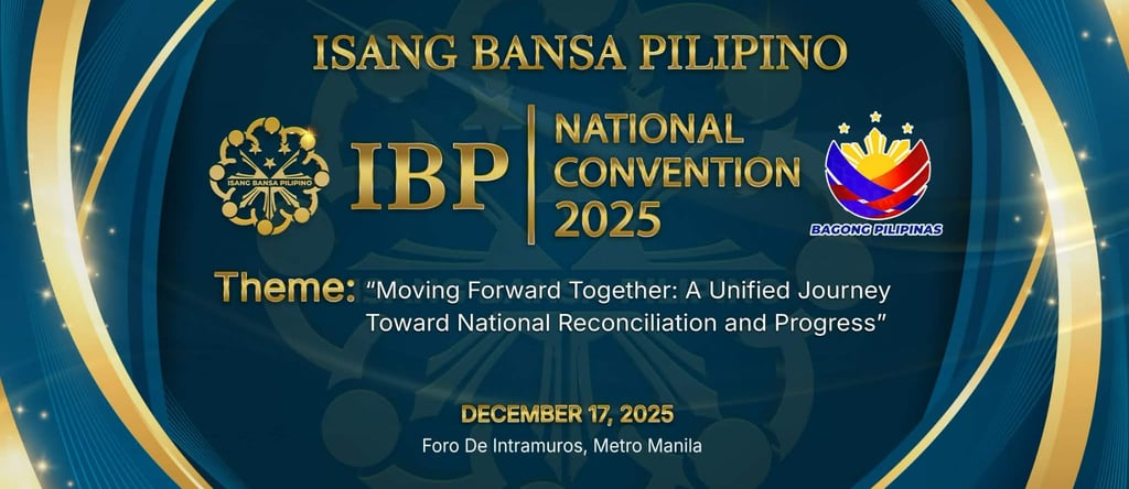 Isang Bansa Pilipino (IBP) proudly announces the upcoming IBP National Convention 2025, to be held on December 17, 2025, at Foro de Intramuros, Metro Manila. Organized under the Office of the Founder & Chairman, this significant national gathering reaffirms IBP’s commitment to promoting civic engagement, strengthening democratic participation, and fostering collaborative leadership across the country. The Convention serves as a distinguished venue for members, leaders, and partners to unite in advancing the organization’s shared aspirations for national development.